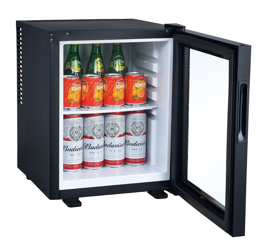 A 0 dB absorption minibar with adjustable shelves, LED lighting, and silent performance – available in 35L size for modern hospitality spaces.
